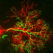 昆虫の脳は人と同じ神経細胞(ニューロン)から構成されている。しかし、その数はヒトが1000億出るのに対して、その100万分の1である10万個程度である。神経細胞は左の図のように非常に複雑な形をもち、その形も重要な意味をもつ。個々の神経細胞の形態情報も含め、正確に昆虫の脳全体を再現することにより、シミュレーションによりその働きを解明するとともん、脳科学の実験に生かすことで、脳の理解と再現を目指す。