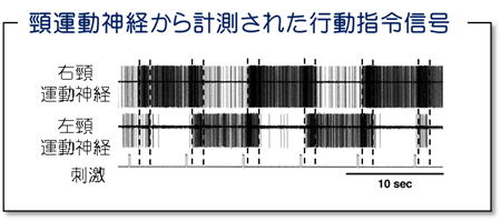 これらの下降性神経は,頸運動神経に神経信号を伝達する.左右の頸運動神経から,吸引電極を用いて神経信号を計測する。 | |||