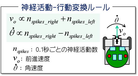 頸運動神経からの神経応答をロボットの行動に変換するために,前進速度は,左右の頸運動神経の神経活動の総計に,角速度は,差分に比例するというルールを作成した.これにより,ロボットに動作指令を与えた。 | |||