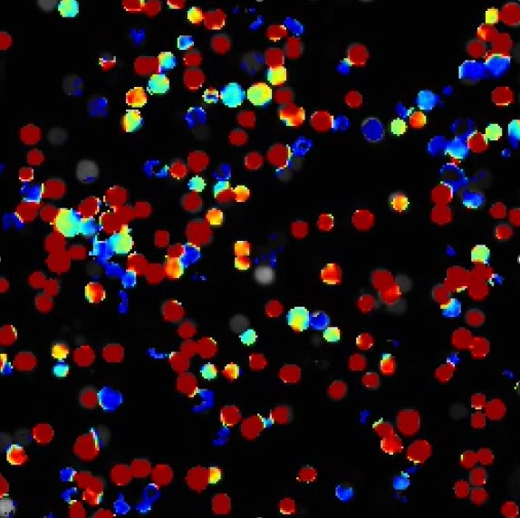 昆虫の培養細胞に特定の匂いに反応する昆虫嗅覚受容体を発現させた匂いセンサ(センサ細胞)。特定の匂いに反応して蛍光強度が変化する。蛍光強度の変化を色の変化として表示した。
