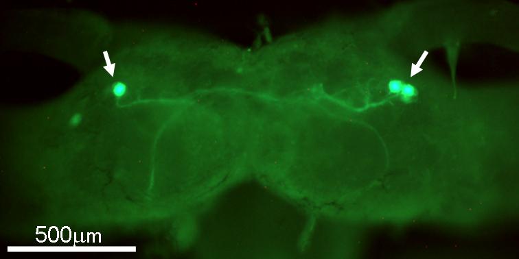 脳内の特定の神経回路の可視化、神経活動の計測、神経活動の阻害を可能にする遺伝子組換え技術は、多くの神経細胞が複雑に結合したネットワークを形成する脳神経系を解析するための欠かせないツールの一つになりつつあります。本研究では、カイコガ脳で発現するさまざまな遺伝子のプロモーター領域を利用し、特定の神経細胞群で外来遺伝子を発現する遺伝子組換えカイコガの作出を行っています。図は、神経ホルモンである前胸腺刺激ホルモン(PTTH)のプロモーター配列により蛍光タンパク質を発現する遺伝子組換えカイコガの脳の蛍光写真を示しています。PTTH神経分泌細胞が特異的に緑色の蛍光で可視化されていることがわかります。