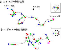 図2.神経回路モデルで動く匂い源探索ロボットが風洞内に設置されたフェロモンを探索する様子と匂い源探索の移動軌跡.