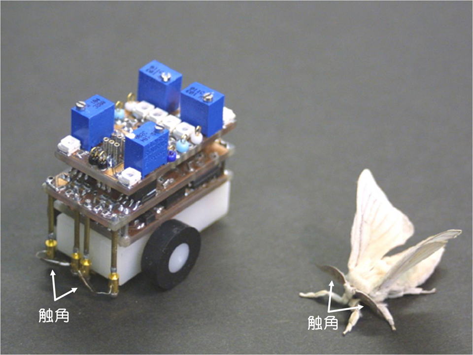 図1.神経回路モデルで動く昆虫サイズの匂い源探索ロボット.オスのカイコガ(右)がメスのフェロモンの匂いでメスを探索する行動を引き起こす脳内神経回路を分析し,それを基盤に構築した神経回路モデルを搭載した昆虫サイズのロボット.フェロモンを検知するセンサは人工的なセンサがないので,オスカイコガの触角を切り取り,それをセンサとして用いた.