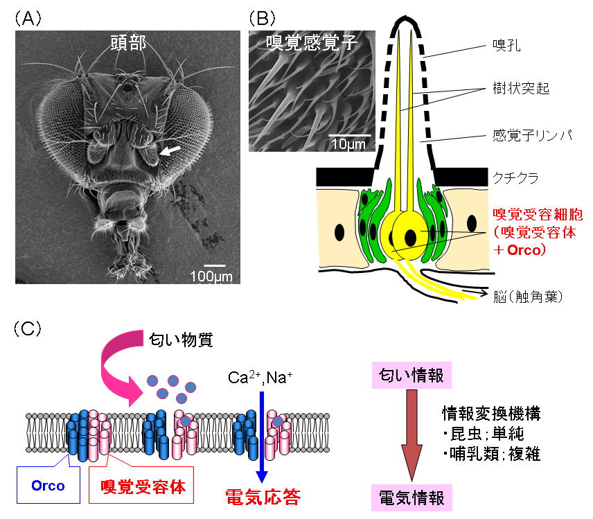 ![]() 図1 生物の嗅覚受容器官の構造と分子メカニズム (A)昆虫頭部の走査電子顕微鏡写真。矢印は触角を示す。(B)嗅覚感覚子の電子顕微鏡写真と模式図。匂い物質は嗅孔から入り、感覚子リンパ中の可溶性タンパク質で輸送され、樹状突起膜上に存在する嗅覚受容体に到達する。その後、匂い情報は嗅覚受容細胞で電気情報へと変換され、脳(触角葉)に伝達される。(C)昆虫生体における嗅覚受容の分子メカニズム。嗅覚受容体は匂い物質を受容すると、細胞外から細胞内へ陽イオン(Ca2+、Na+)を流入する。二次情報伝達物質を介した複雑な情報変換機構を採用する哺乳類の嗅覚受容体と比べ、昆虫の嗅覚受容体は単純な情報変換機構により細胞内へシグナルを伝える。 |