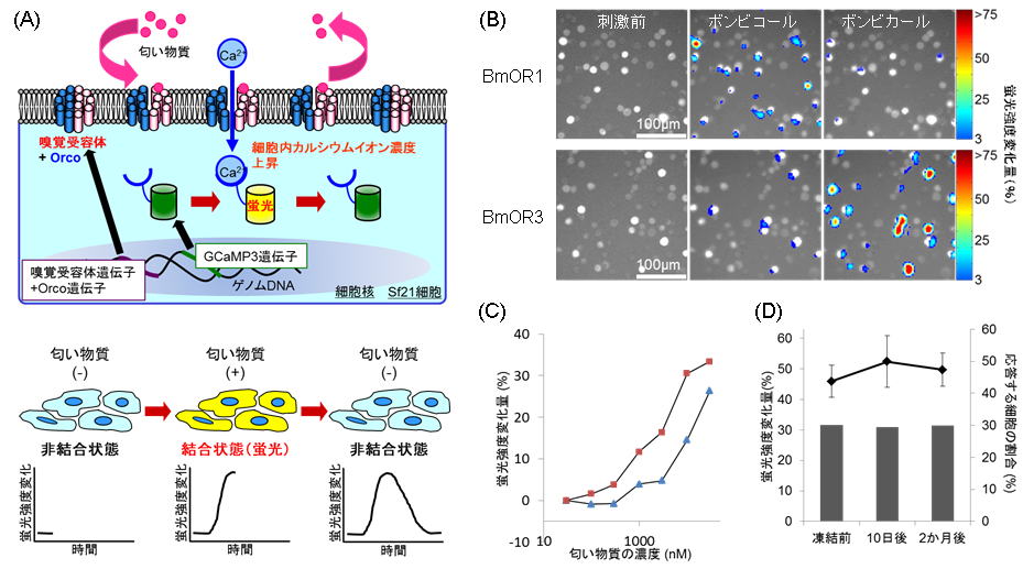 ![]() 図2 センサ細胞の匂い検出の模式図と性能評価 (A)センサ細胞の応答メカニズム。昆虫の嗅覚受容体遺伝子、Orco遺伝子及びカルシウム感受性蛍光タンパク質(GCaMP3)遺伝子をゲノムDNAに組み込んだSf21細胞系統を樹立した。非結合状態の嗅覚受容体に、匂い物質が結合すると、イオンチャネルが開く。これにより、細胞外からカルシウムイオンが流入し、GCaMP3と結合することで、細胞の蛍光強度が上昇する。嗅覚受容体が匂い分子を解離し非結合状態になると、イオンチャネルが閉じ、蛍光が基底状態へと戻る。(B)BmOR1系統とBmOR3系統の匂い選択性。各細胞系統にそれぞれ10µMのボンビコール、10µMのボンビカールを添加した。BmOR1系統はボンビコールに特異的に、BmOR3系統はボンビカールに特異的に蛍光応答を示した。細胞の蛍光強度変化量は疑似カラーで表した。カラーバーは⊿F(蛍光強度変化量)/F(刺激前の蛍光強度)×100(%)の値を表し、暖色ほど蛍光強度変化量の大きい細胞を表す。(C)BmOR1系統、BmOR3系統におけるボンビコール、ボンビカール刺激に対する応答の濃度依存性。(D)BmOR3系統における長期培養後の匂い検出の安定性。蛍光強度変化量を折れ線グラフ、応答する細胞の割合を棒グラフで示す。10日後、2か月後の細胞系統も凍結前と同じ匂い検出性能を示した。 |
