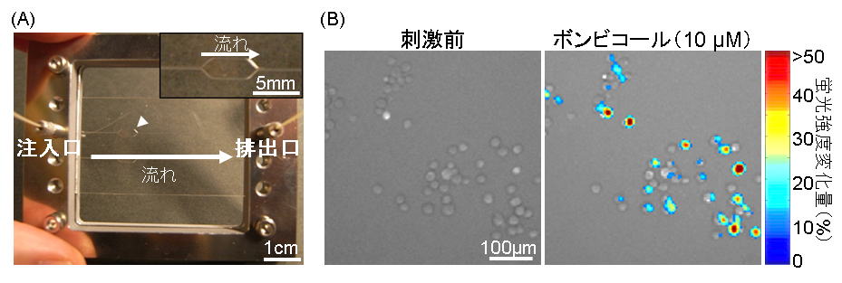 ![]() 図3 センサ細胞を導入したチップの構造と応答 (A)マイクロ化学チップ(マイクロ化学技研株式会社製)の構造。チップはガラス及びアルミニウムフレームからなる。注入口から細胞や培養液、刺激を注入できる。挿入図は培養部位(白三角印)の拡大写真を示す。(B)チップ中の細胞の蛍光応答。BmOR1系統をチップに導入し、10µMのボンビコールで刺激した。細胞の蛍光強度変化量は疑似カラーで表した。チップ中の細胞から蛍光強度変化を取得できた。 |