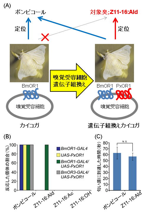 ![]() 図4 センサ昆虫の概念図と定位行動7) (A)センサ昆虫の概念図。ボンビコールを受容する嗅覚受容細胞に、対象となるコナガの性フェロモン受容体PxOR1を組み換えたカイコガを作出することで、カイコガが本来応答しないZ11-16:Aldを検出し、発信源に定位するカイコガが作出できる。(B)ボンビコールとコナガ性フェロモン成分に対して行動を発現した個体の割合。PxOR1発現カイコガ(BmOR1-GAL4/UAS-PxOR1)では全個体がZ11-16:Ald(100 ng/filter paper)に反応を示した。BmOR1-GAL4、UAS-PxOR1 はPxOR1 を発現しないバックグランド系統を示す。(C)PxOR1 発現カイコガのボンビコールまたはZ11-16:Ald 匂い源への定位時間の比較。100 ng の各フェロモン成分をしみこませたろ紙をそれぞれ匂い源とした。定位時間に有意差は認められなかった。(参考文献7から改変して引用) |